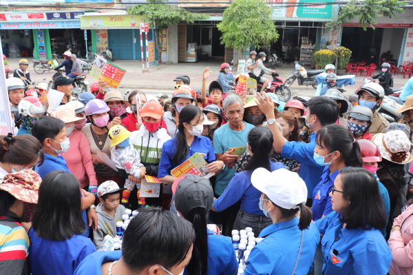 Huyện Đoàn Đông Hòa tổ chức cấp phát khẩu trang và dung dịch rửa tay khô phòng chống dịch bệnh viêm đường hô hấp cấp do chủng mới của vi rút corona gây ra cho bà con nhân dân.