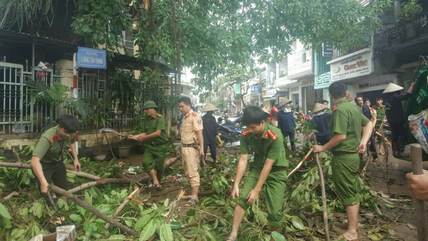 Đoàn viên, thanh niên và các chiến sĩ ở huyện Đồng Xuân tham gia dọn vệ sinh, quét dọn cây xanh bị ngã.