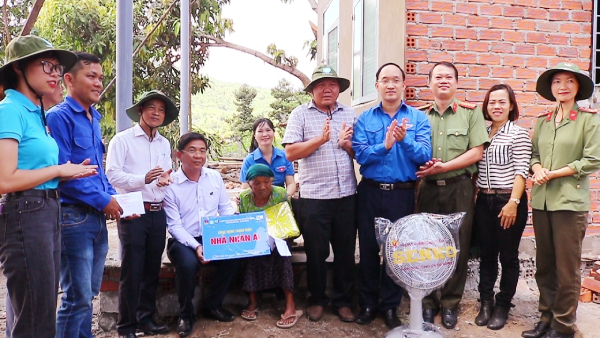 Cũng tại đây, Thường trực Tỉnh Đoàn, Ban Giám hiệu Trường Cao đẳng Công thương Miền Trung, Huyện ủy, UBND huyện Sông Hinh đã tặng quà động viên các chiến sĩ tình nguyện Mùa hè xanh của trường và tặng quà cho cụ bà Hờ DLiê Niê khi về nhà mới.
