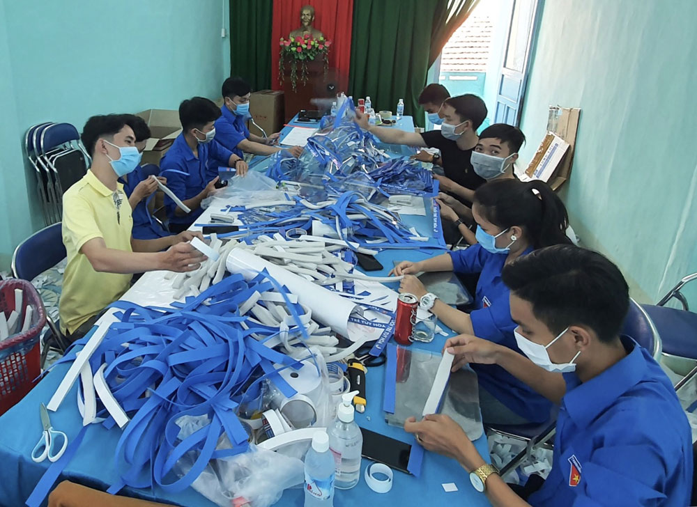 Các tình nguyện viên Đội hình phản ứng nhanh phòng, chống dịch bệnh COVID-19 TP Tuy Hòa làm mũ kính chống giọt bắn tặng cho các điểm phong tỏa, cách ly.