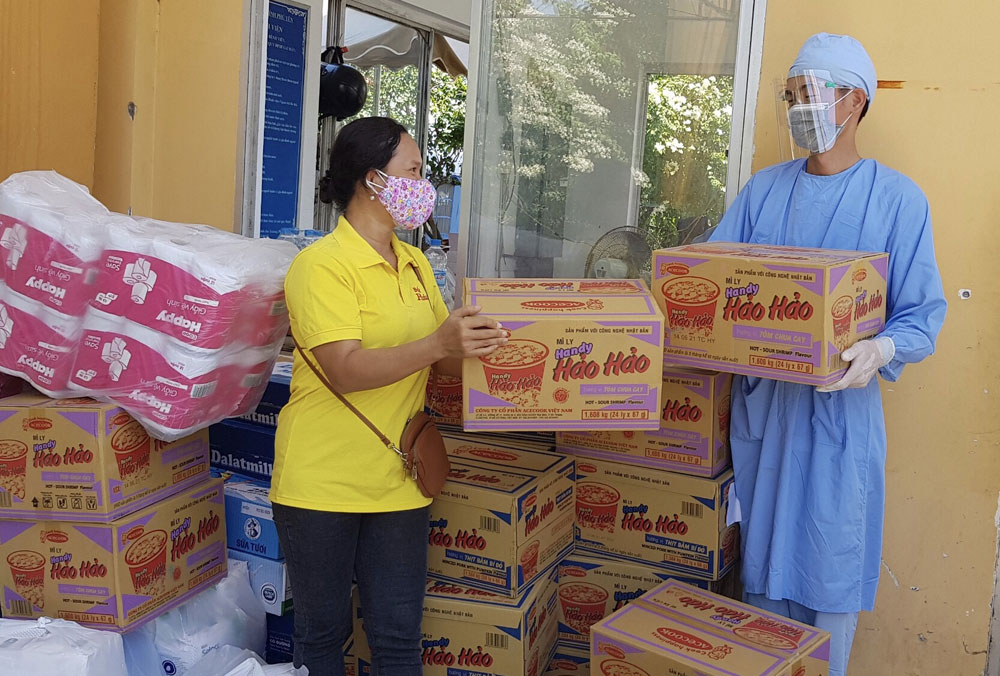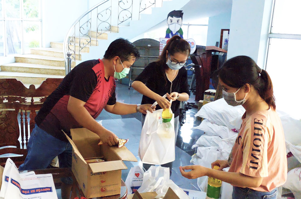 Cán bộ Tỉnh đoàn phân quà của các mạnh thường quân để chuyển hỗ trợ cho người dân ở các điểm phong tỏa, cách ly do dịch bệnh.