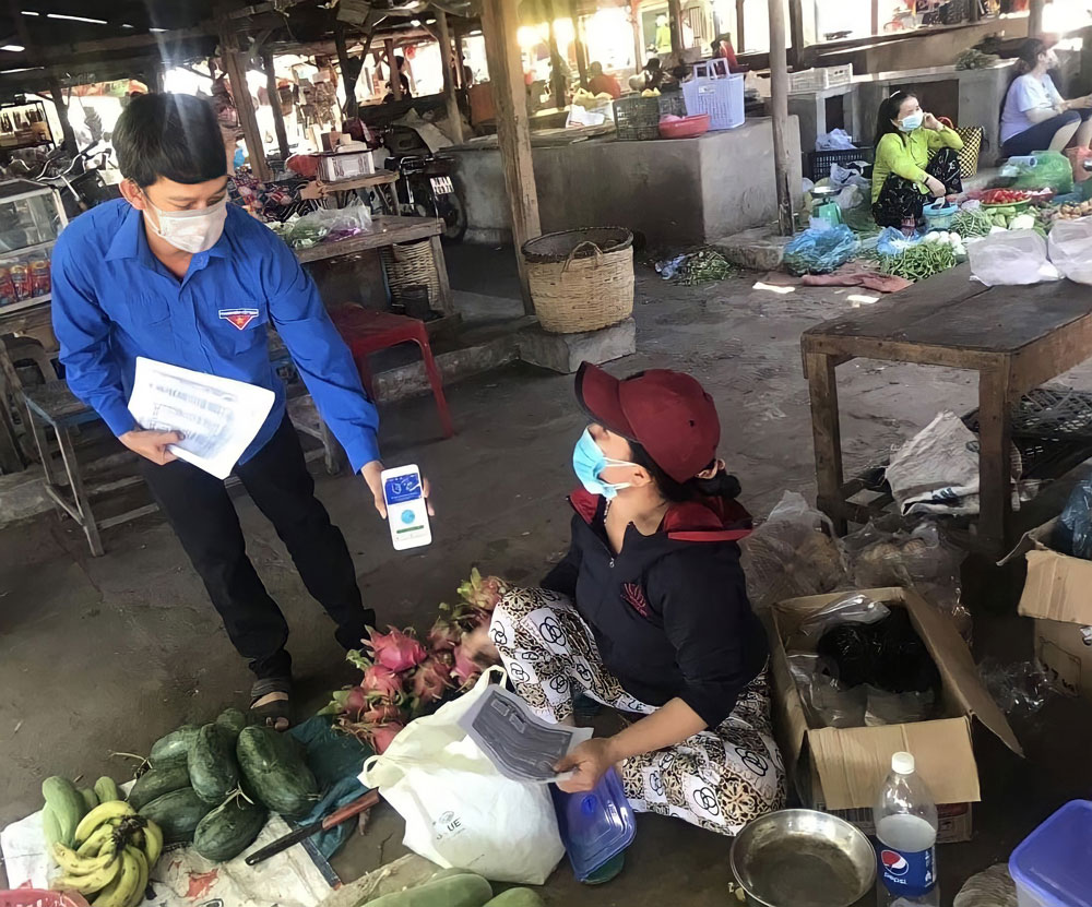 ĐVTN huyện Tây Hòa hướng dẫn tiểu thương cài đặt ứng dụng Bluezone - hỗ trợ phát hiện truy vết nhanh những người có nguy cơ lây nhiễm.