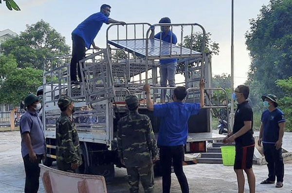 Tuổi trẻ huyện Sơn Hòa phối hợp lực lượng quân sự huyện bố trí giường để chuẩn bị cho các khu cách ly trên địa bàn huyện.