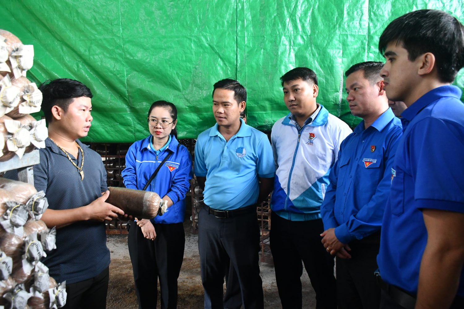 Đoàn tham quan, học tập mô hình trồng nấm bào ngư xám của thanh niên Cao Xuân Thảo (xã An Lĩnh, huyện Tuy An).