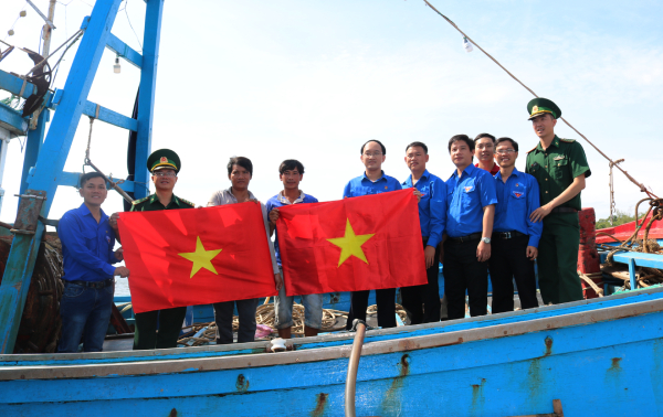 Tặng cờ Tổ quốc cho các gia đình ngư dân.