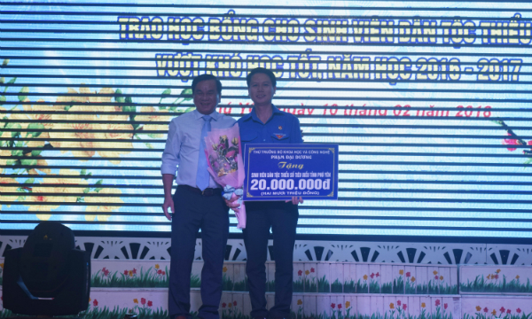 Dịp này, Công ty Cổ phần đầu tư APHA B dành tặng 50 suất học bổng; Thứ trưởng Bộ Khoa học Công nghệ Phạm Đại Dương trao 20 suất học bổng dành cho sinh viên Phú Yên là người dân tộc thiểu số có thành tích vượt khó học tốt trong năm học 2016 - 2017, mỗi suất trị giá 1 triệu đồng.
