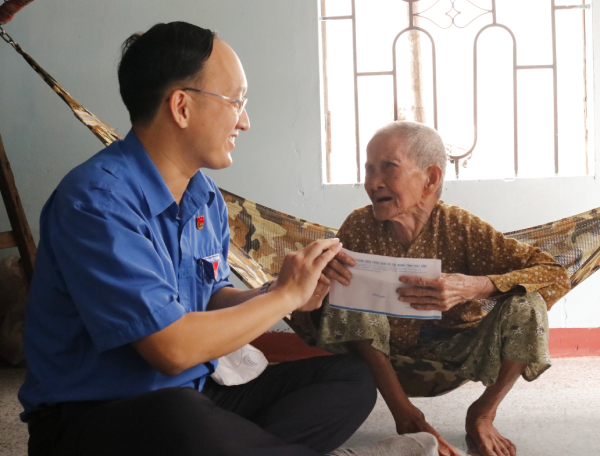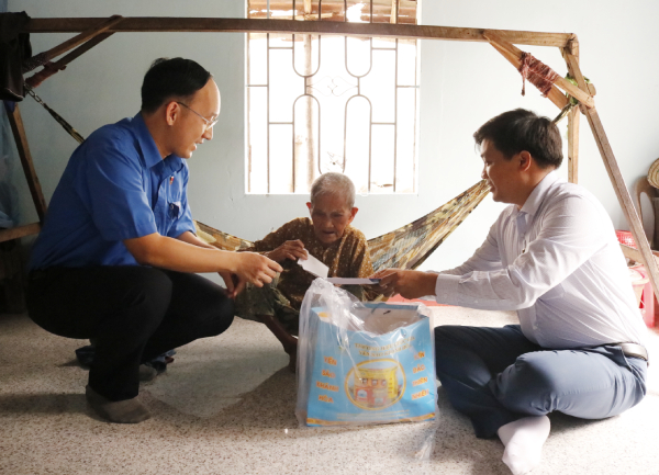 Phó Bí thư Tỉnh Đoàn, Chủ tịch Hội Sinh viên tỉnh Trần Minh Trí và đại diện nhà tài trợ tặng quà cho cụ bà Phan Thị Hạnh khi về nhà mới.