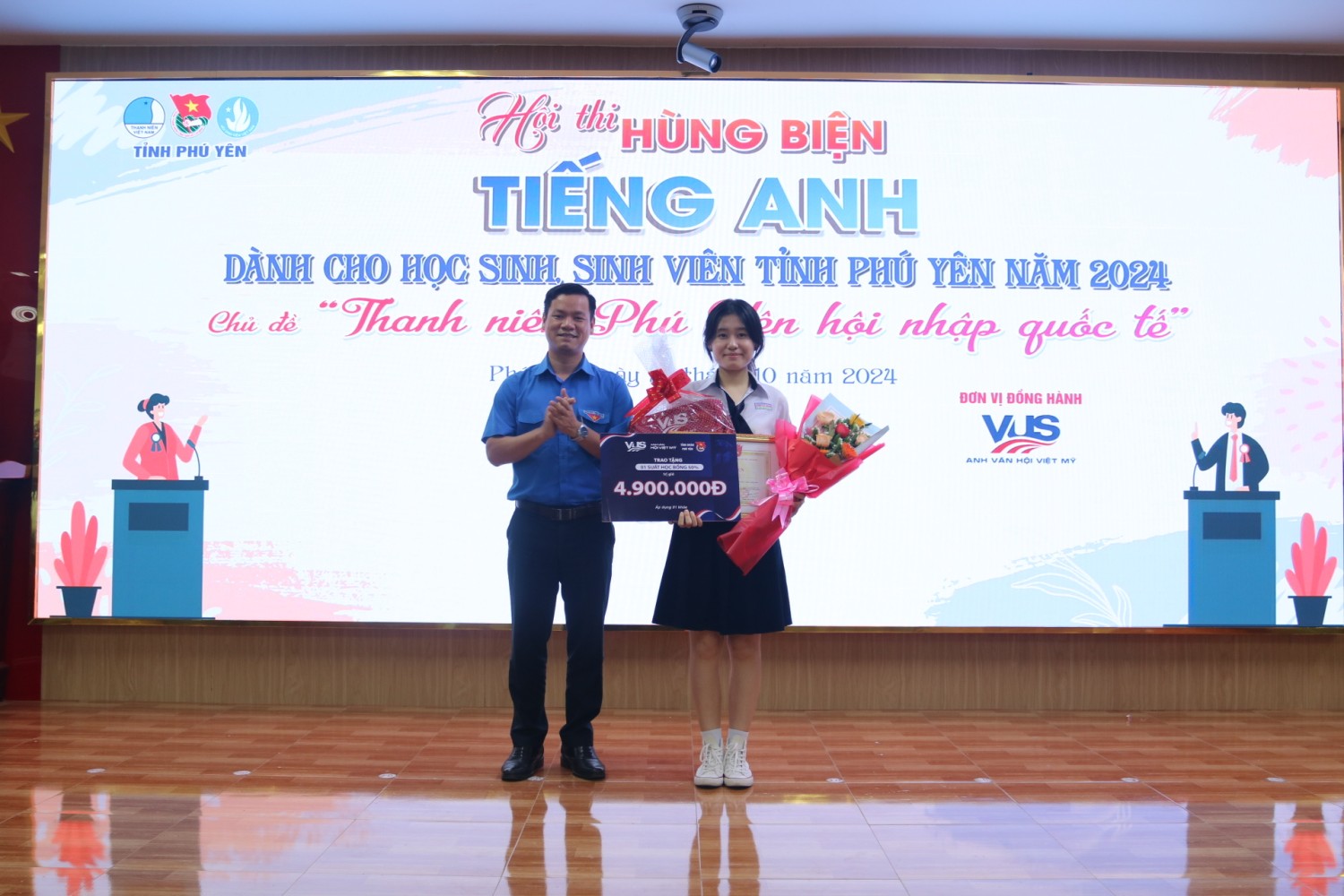 Đ/c Võ Duy Kha, Phó Bí thư Tỉnh Đoàn, Chủ tịch Hội Sinh viên Việt Nam tỉnh trao giải nhất cho thí sinh Võ Đan Quỳnh, Trường THPT chuyên Lương Văn Chánh.