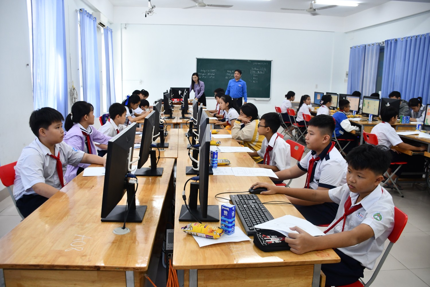 Các thi sinh tham gia thi kỹ năng lập trình dành cho cấp Tiểu học trên máy tính.