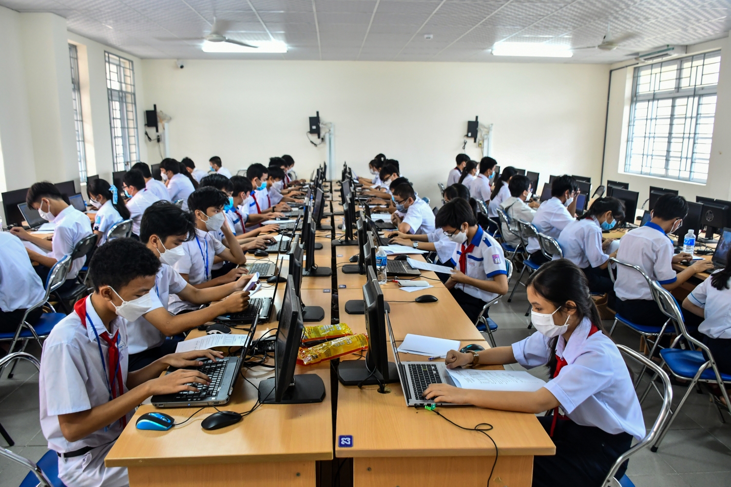 Các thí sinh tham gia kỹ năng lập trình, hướng tạo ra sản phẩm trên máy tính.