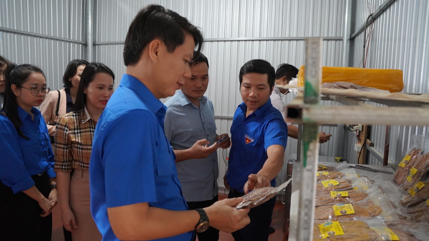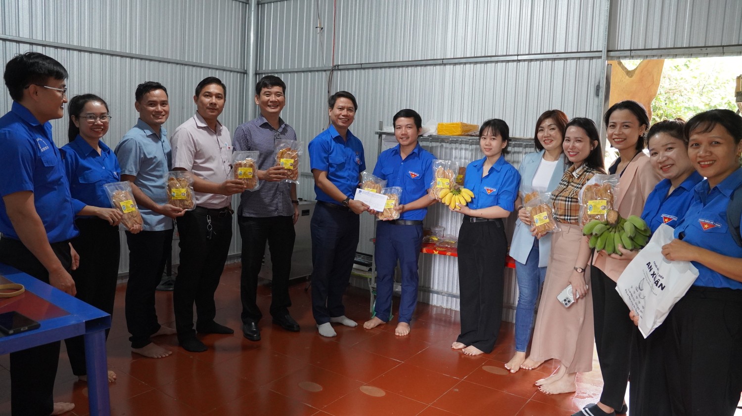 Thường trực Tỉnh Đoàn, Hội LHTN Việt Nam tỉnh, Hội Doanh nhân trẻ tỉnh chụp hình lưu niệm tại mô hình Chuối ép sấy dẻo An Xuân của thanh niên Phạm Ngọc Toàn.