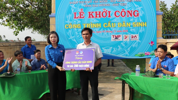 Đồng chí Sái Thị Yến - Bí thư Tỉnh Đoàn Hải Dương trao biểu trưng hỗ trợ xây dựng cầu dân sinh cho địa phương.