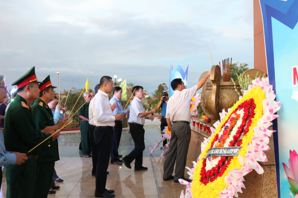 Các đồng chí lãnh đạo tỉnh và đoàn viên, thanh niên dâng hương, đặt vòng hoa tưởng niệm các anh hùng liệt sĩ tại Đài tưởng niệm.