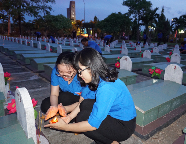 Mở đầu Lễ thắp nến tri ân, các đồng chí lãnh đạo, đại biểu, đoàn viên, thanh niên, hội viên và bà con nhân dân đã dâng hoa, hương lên Đài tưởng niệm; đồng thời, thắp sáng nến trên các phần mộ liệt sĩ. Tiếp theo đó, các ca sĩ, diễn viên đến từ Nhà hát Ca múa nhạc Sao Biển đã mang đến một không khí hào hùng nhưng cũng đầy xúc động với Chương trình nghệ thuật mang chủ đề “Đồng đội ơi”.