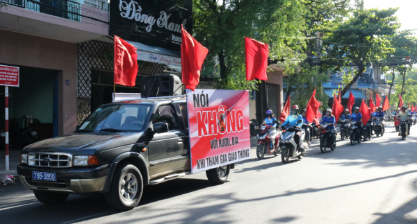 Đoàn viên, thanh niên tham gia diễu hành tuyên truyền Luật an toàn giao thông.