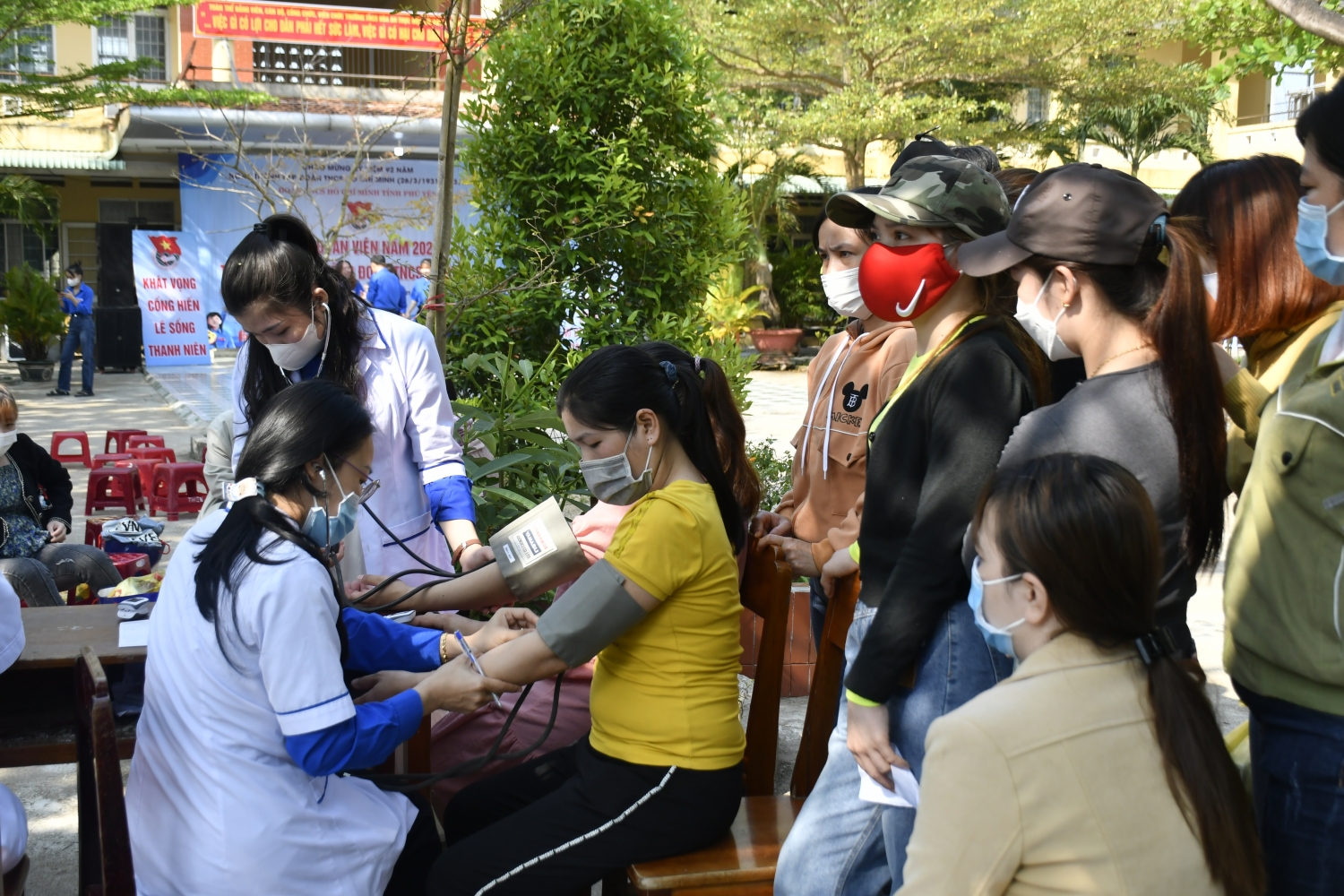 Đội ngũ y, bác sĩ trẻ khám và cấp phát thuốc cho công nhân cụm Công nghiệp Hòa An.
