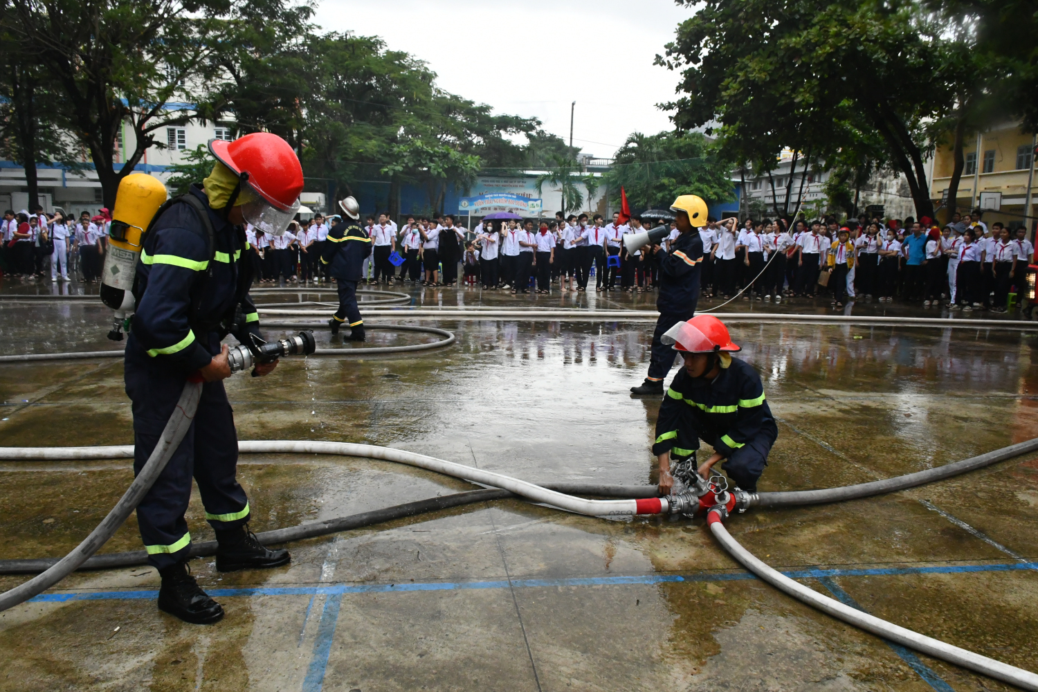Diễn tập tình huống giả định các biện pháp chữa cháy, cứu hộ, cứu nạn ban đầu, hướng dẫn học sinh di chuyển thoát nạn.