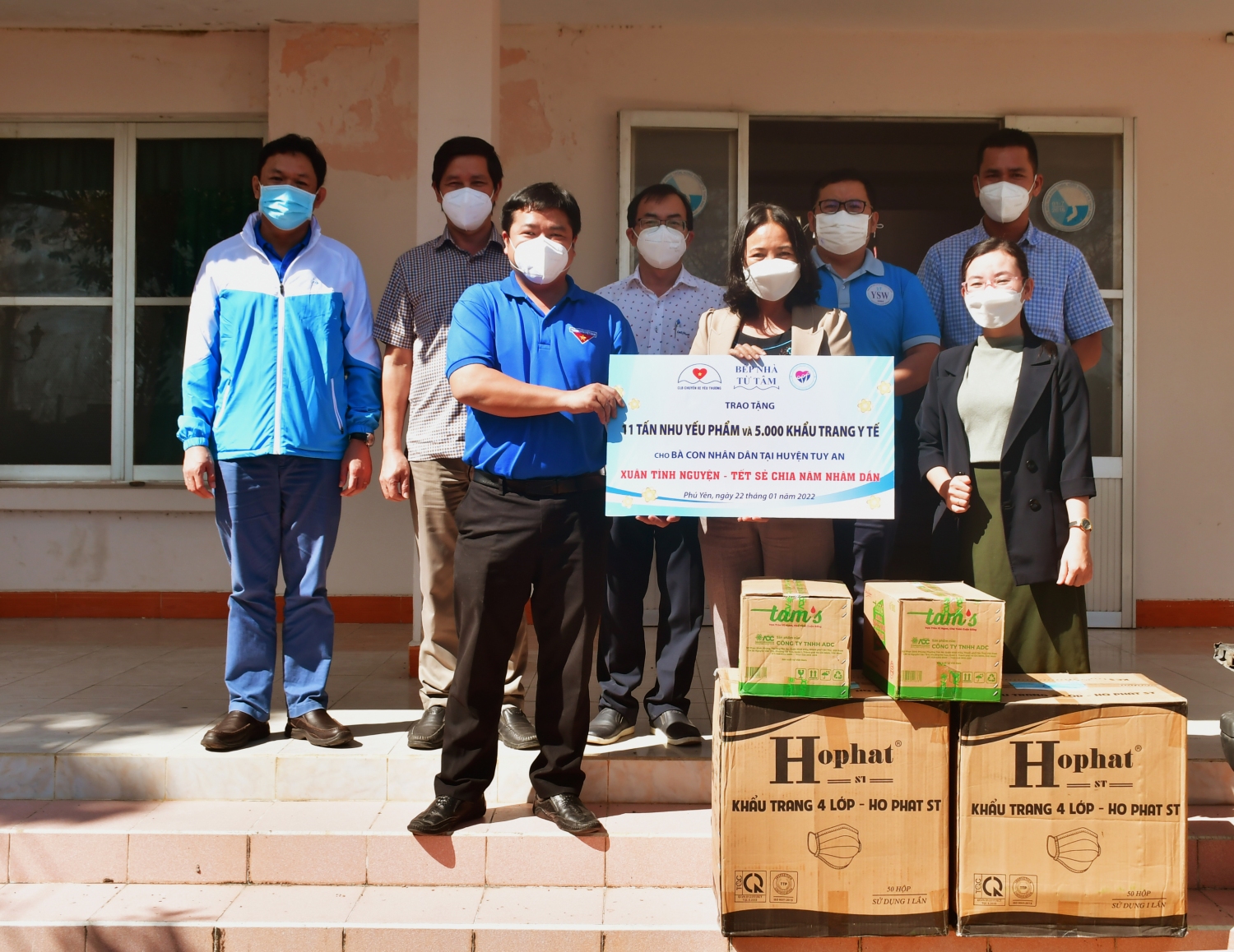 Số nhu yếu phẩm và trang thiết bị y tế trên được phân bổ như sau: huyện Sơn Hòa (12 tấn gạo, 500 chai nước tương, 2.500 khẩu trang y tế); thị xã Sông Cầu (10 tấn gạo, 5.000 khẩu trang y tế); huyện Đồng Xuân (10 tấn gạo, 5.000 khẩu trang y tế); huyện Tuy An (10 tấn gạo, 1.000 chai nước tương, 5.000 khẩu trang y tế); huyện Sông Hinh (03 tấn gạo, 1.000 chai nước tương, 5.000 khẩu trang y tế); thành phố Tuy Hòa (2.000 chai nước tương, 5.000 khẩu trang y tế); phường Phú Thạnh, thành phố Tuy Hòa (05 tấn gạo và 25.000.000 đồng); Bếp nhà Từ tâm (05 tấn gạo, 1.000 chai nước tương); Ban bảo vệ chăm sóc sức khỏe tỉnh Phú Yên (10.000 khẩu trang và 200 bộ quần áo bảo hộ)…