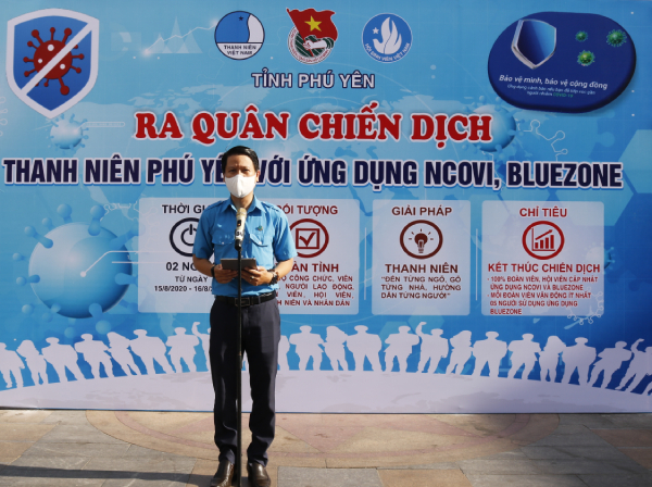 Với chủ đề “Thanh niên Phú Yên với ứng dụng NCOVI và Bluezone”, chiến dịch diễn ra từ ngày 15 - 16/8/2020. Tại buổi ra quân, anh Lương Minh Tùng - Phó Bí thư Tỉnh Đoàn, Chủ tịch Hội LHTN Việt Nam tỉnh kêu gọi các cấp bộ Đoàn, Hội hãy xung kích đi đầu, chủ động phối hợp với các Ban, Ngành, Mặt trận, Hội, Đoàn thể, thành lập các đội thanh niên xung kích tình nguyện tuyên truyền, hướng dẫn bà con Nhân dân cài đặt, sử dụng, cập nhật ứng dụng NCOVI và Bluezone với phương châm “Đến từng ngõ, gõ từng nhà, hướng dẫn từng người” đảm bảo mỗi đoàn viên, hội viên, thanh niên hướng dẫn ít nhất 05 người cài đặt và sử dụng ứng dụng Bluezone; các đội hình tình nguyện tham gia chiến dịch hãy luôn luôn đảm bảo an toàn, thực hiện đầy đủ các biện pháp phòng dịch cho bản thân và người dân, thực hiện đảm bảo các tiêu chí đề ra và tạo sự lan tỏa mạnh mẽ, rộng rãi trong cộng đồng.
