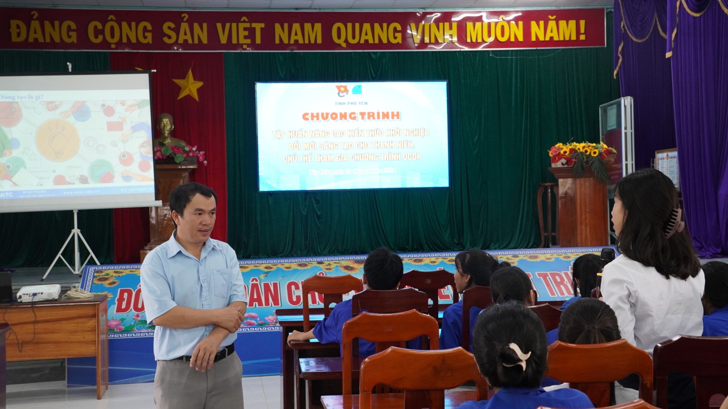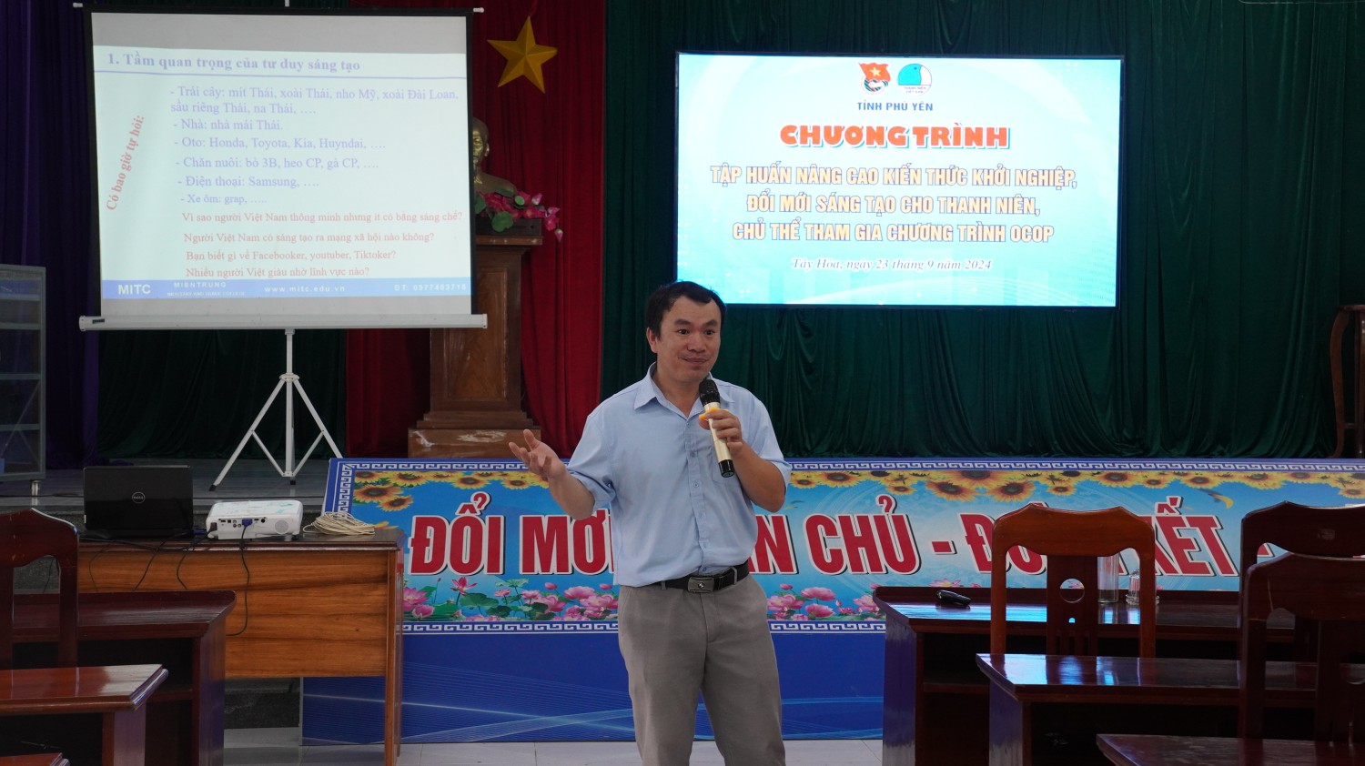 Tiến sỹ Võ Anh Khuê - Thành viên mạng lưới hỗ trợ khởi nghiệp đổi mới sáng tạo quốc gia - Phó Trưởng phòng Quản lý chất lượng và Nghiên cứu khoa học Trường Cao đẳng Công Thương miền Trung tập huấn chương trình “Mỗi xã một sản phẩm” (OCOP) cho cán bộ Đoàn, Hội, đoàn viên, thanh niên và người dân trên địa bàn huyện Tây Hòa.