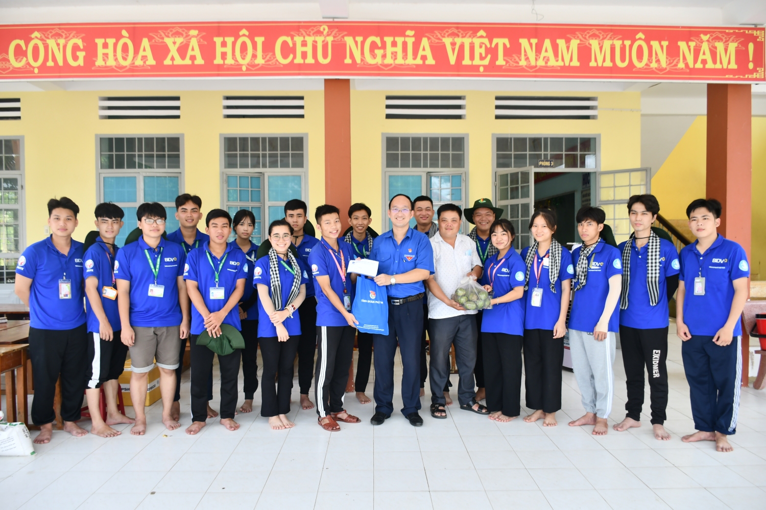 Đồng chí Trần Minh Trí tặng quà động viên đội hình sinh viên tình nguyện Trường Đại học Sư phạm Kỹ thuật TP. Hồ Chí Minh đang đóng quân tại mặt trận xã Xuân Phước, huyện Đồng Xuân.