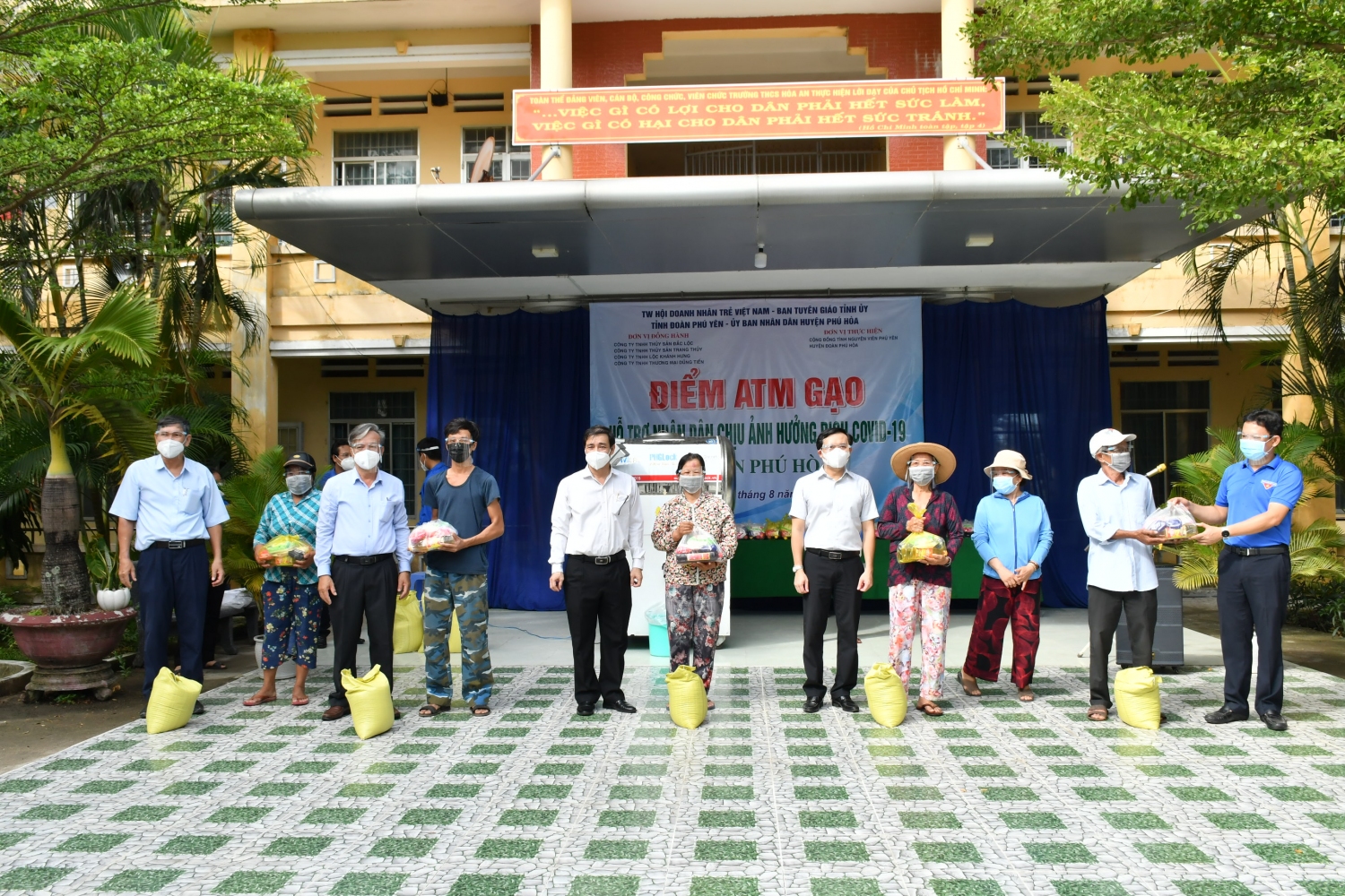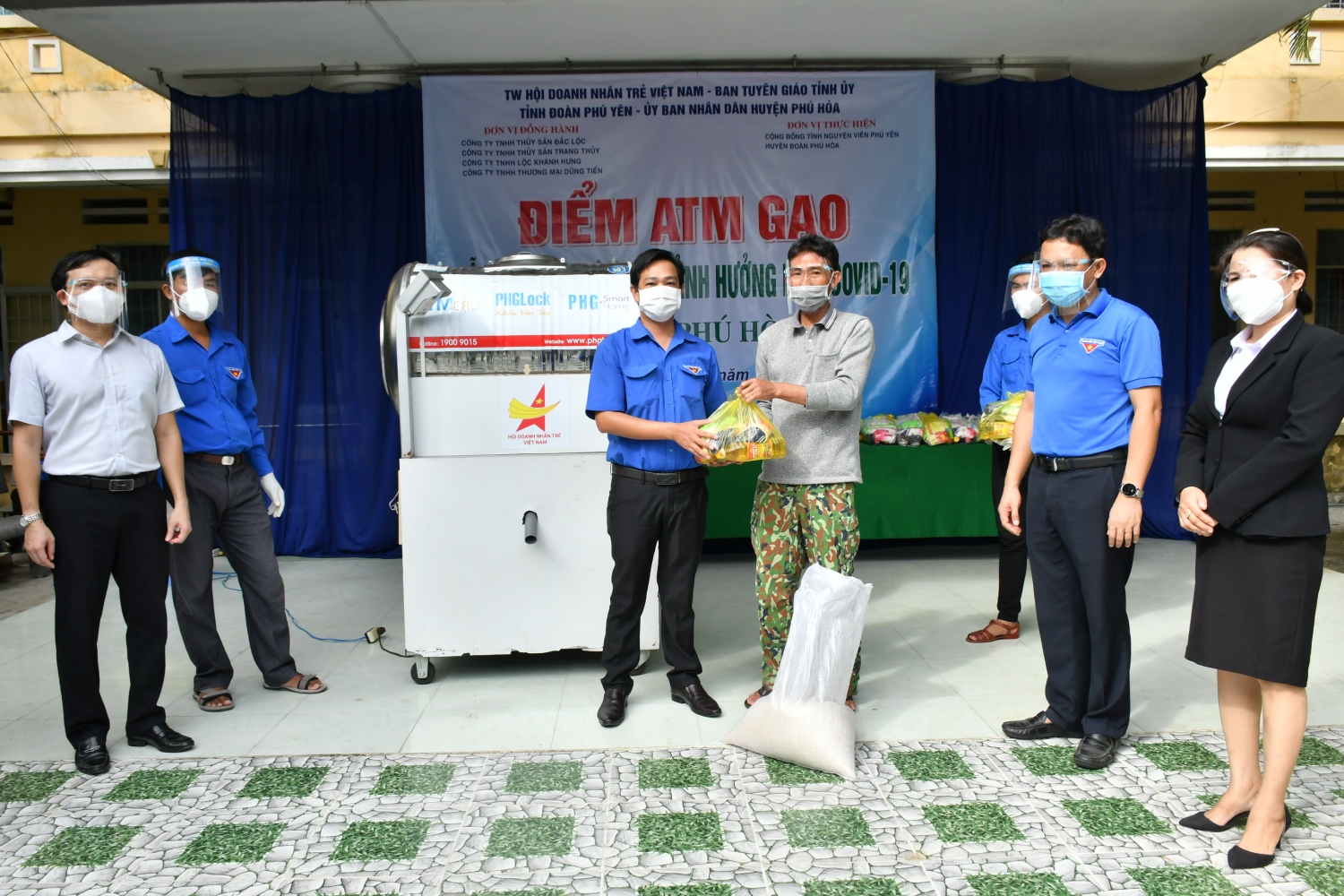 Theo đó, điểm “ATM gạo” được đặt tại Trường THCS Hoà An, xã Hòa An, huyện Phú Hòa. Thời gian triển khai vận hành mô hình ATM gạo diễn ra trong vòng 20 ngày kể từ ngày 24/8/2021, với số lượng được huy động là 11 tấn gạo, được phân bổ cho 9 xã, thị trấn trên địa bàn huyện Phú Hòa. Tại điểm “ATM gạo”, các tình nguyện viên Cộng đồng Tình nguyện viên Phú Yên và đoàn viên, thanh niên huyện Phú Hòa hướng dẫn, phân phối gạo cho người dân, bình quân mỗi người dân sẽ được nhận 10kg gạo/lần từ máy cấp phát. Nguồn lực trên do Ban Tuyên giáo Tỉnh ủy, Tỉnh Đoàn vận động từ các doanh nghiệp: Công ty TNHH Lộc Khánh Hưng, Công ty TNHH Thủy sản Đắc Lộc, Công ty TNHH TM Dũng Tiến, Công Ty TNHH Thủy sản Trang Thủy và các tổ chức, cá nhân là 8,5 tấn gạo; 2,5 tấn gạo do Ủy ban MTTQ Việt Nam huyện và Huyện Đoàn Phú Hòa vận động.