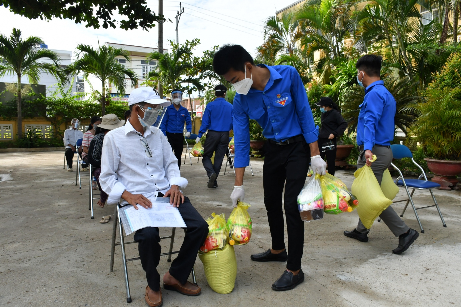 Các tình nguyện viên phân phối gạo hỗ trợ cho người dân.