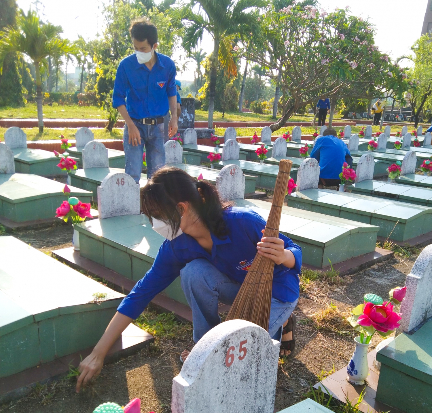 Đoàn viên, thanh niên tham dọn vệ sinh, chăm sóc các phần mộ liệt sĩ.