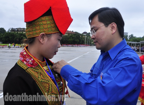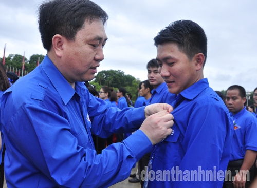 Đồng chí Nguyễn Anh Tuấn - Bí thư BCH Trung ương Đoàn trao huy hiệu thanh niên tiên tiến làm theo lời Bác.
