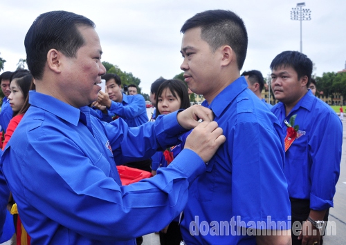 Đồng chí Nguyễn Mạnh Dũng - Bí thư Thường trực BCH Trung ương Đoàn trao huy hiệu thanh niên tiên tiến làm theo lời Bác.