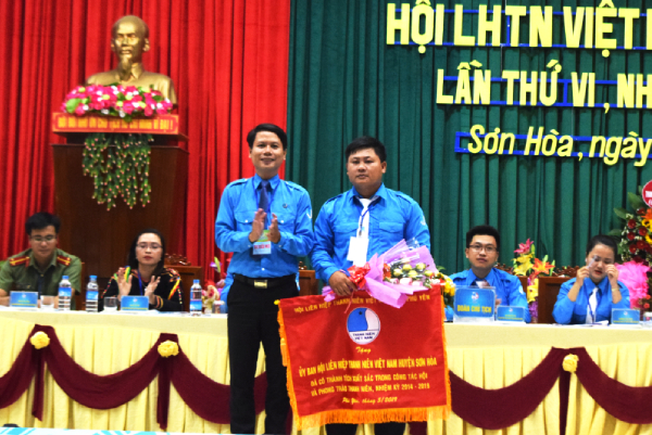 Anh Lương Minh Tùng - Phó Bí thư Tỉnh Đoàn, Chủ tịch Hội LHTN Việt Nam tỉnh tặng cờ thi đua cho Hội LHTN Việt Nam huyện Sơn Hòa