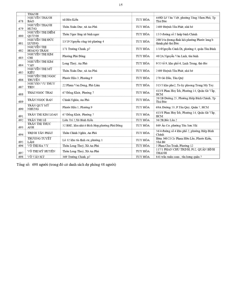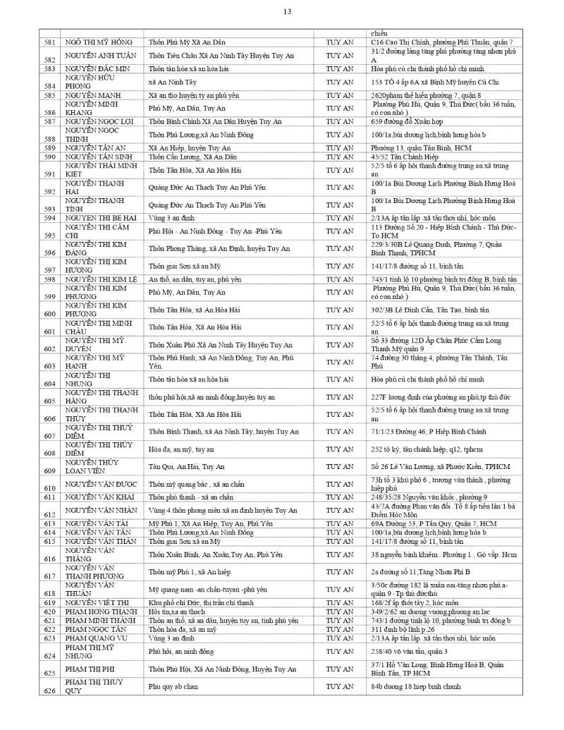 + Danh sách công dân Phú Yên tại TP Hồ Chí Minh dự kiến được đón về quê trong đợt này: