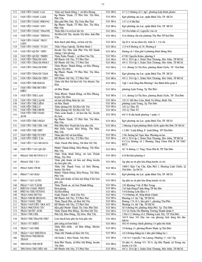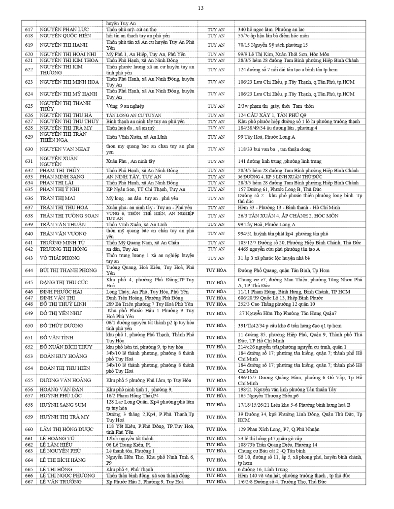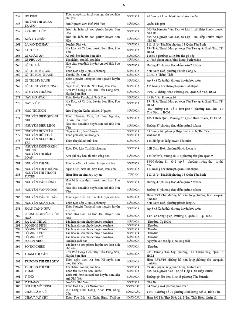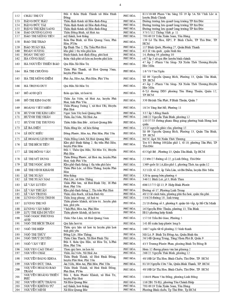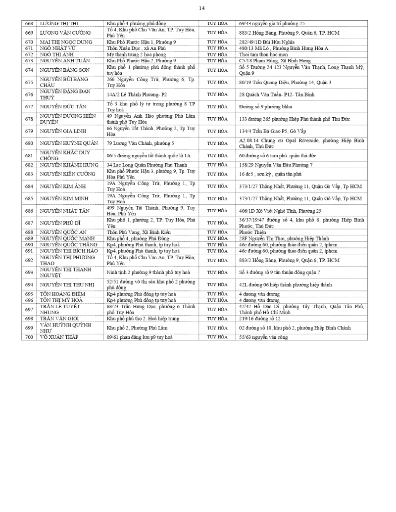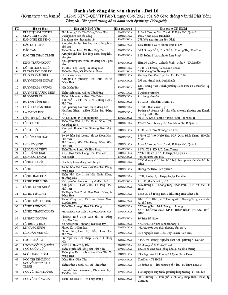 + Dưới đây là danh sách 700 người dân Phú Yên tại TP Hồ Chí Minh dự kiến được đón về quê trong đợt này: