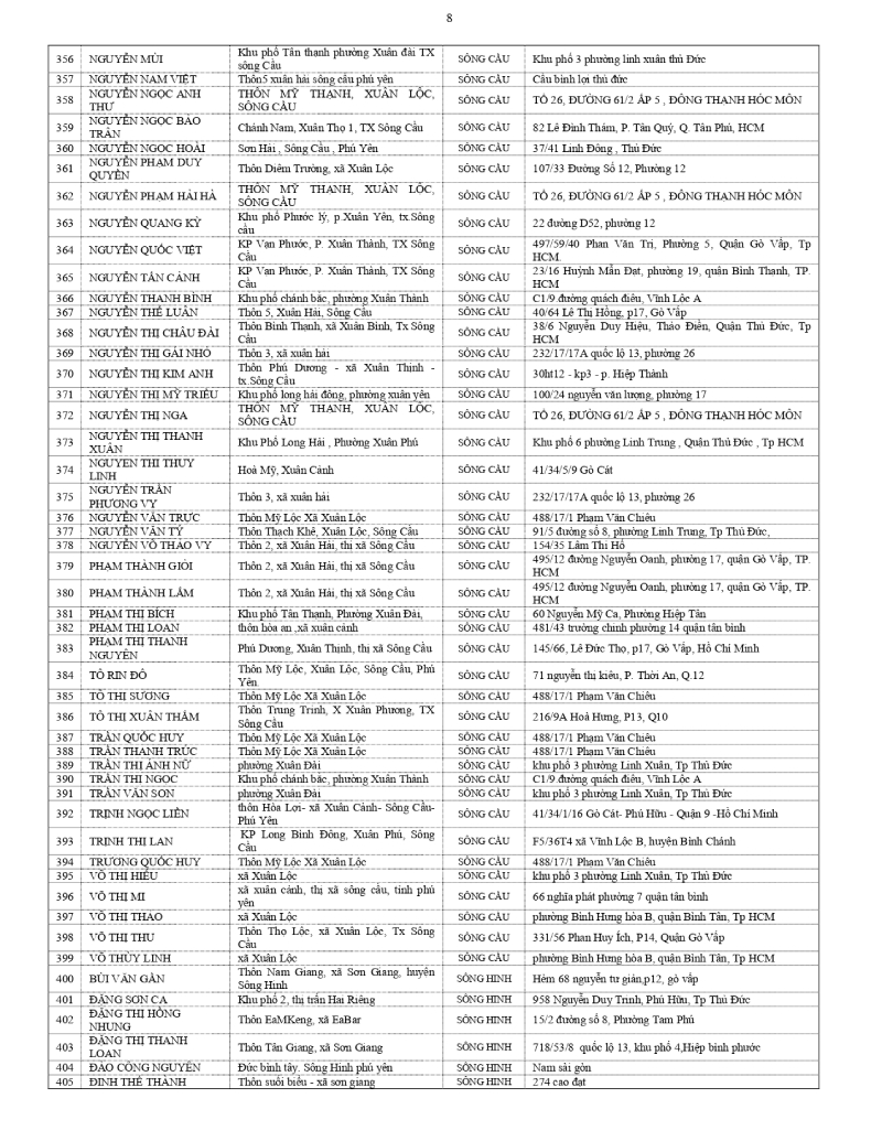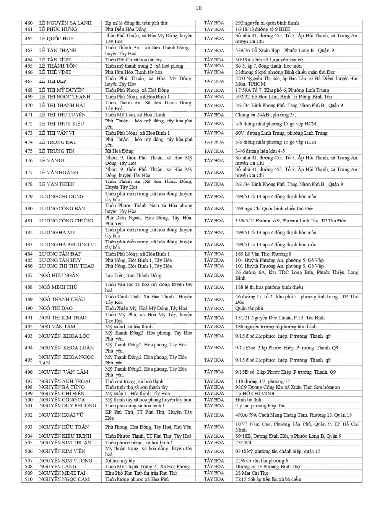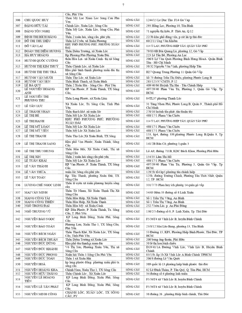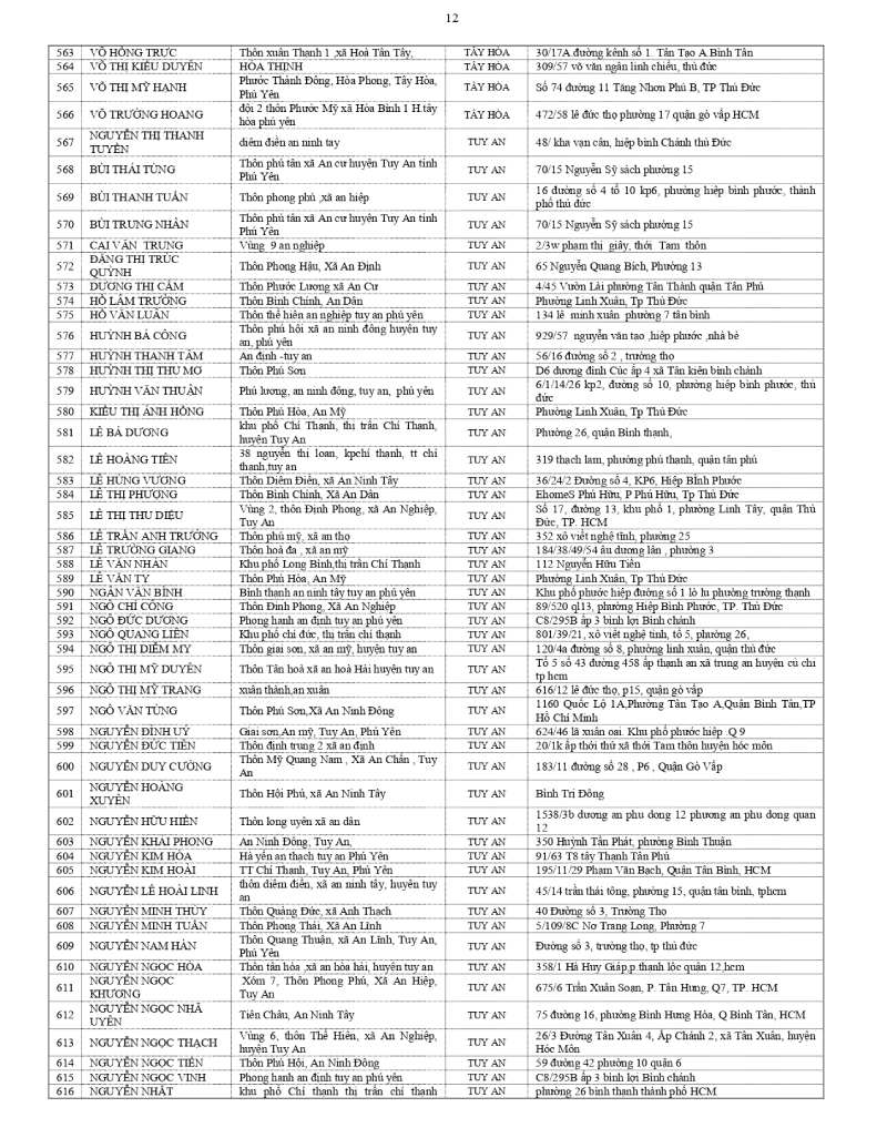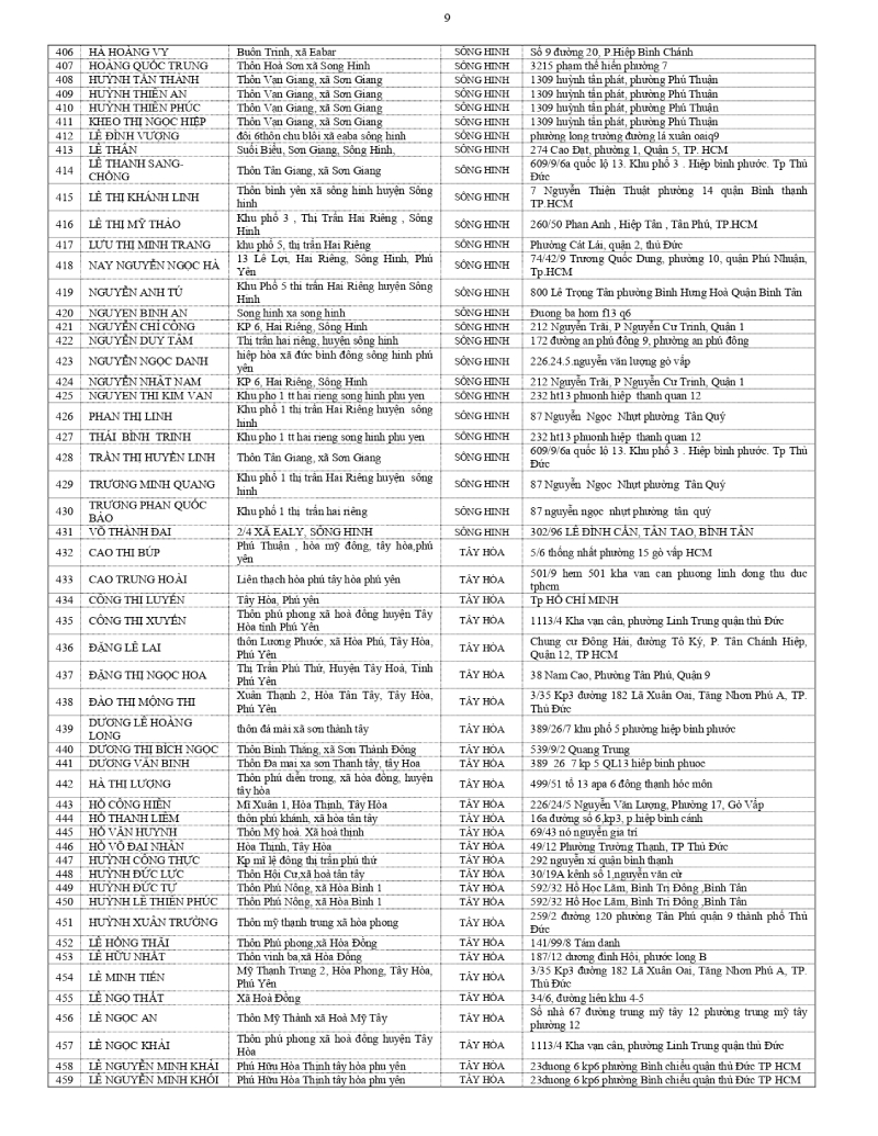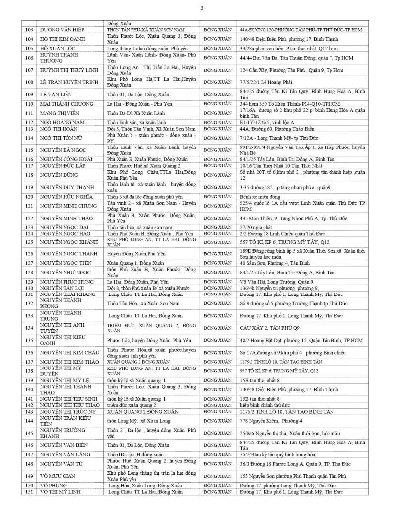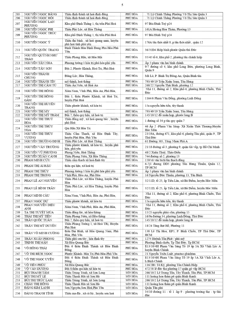 + Dưới đây là danh sách 700 người dân Phú Yên tại TP Hồ Chí Minh dự kiến được đón về quê trong đợt này: