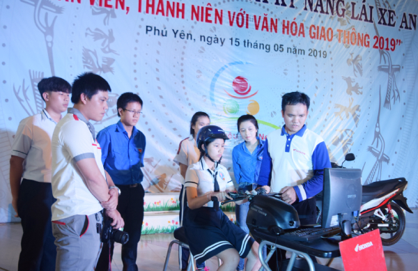 Các đoàn viên, thanh niên thực hành các kỹ năng lái xe an toàn trên máy tập lái Honda Việt Nam (RT).