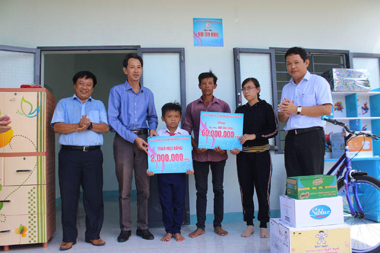 Bí thư Tỉnh Đoàn Phan Xuân Hạnh và Thường trực Hội đồng Đội hai tỉnh Phú Yên, Khánh Hòa bàn giao nhà Búp sen hồng và trao quà cho đội viên có hoàn cảnh khó khăn ở TX Sông Cầu.