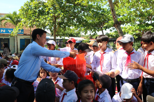 Anh Trần Minh Trí - Phó Bí thư Tỉnh Đoàn, Chủ tịch Hội đồng Đội tỉnh trao quà trung thu cho các em thiếu nhi, học sinh Trường THCS Huỳnh Thúc Kháng.