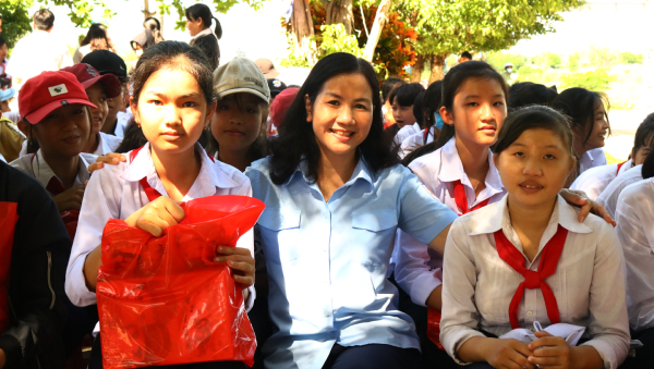 Chị Hoàng Thị Tú Anh - Phó Chủ tịch Hội đồng Đội Trung ương, Giám đốc Trung tâm Hỗ trợ và phát triển thiếu nhi Việt Nam trao quà trung thu cho các em thiếu nhi, học sinh Trường THCS Huỳnh Thúc Kháng.