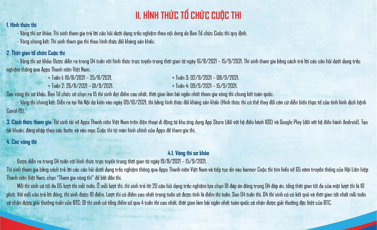Theo Ban Tổ chức, cuộc thi diễn ra từ ngày 19.8 đến 15.9, dành cho cán bộ, hội viên, thanh niên Việt Nam ở trong và ngoài nước, thông qua app Thanh niên Việt Nam. Nội dung thi tập trung vào lịch sử hình thành và phát triển Hội LHTN Việt Nam; các chương trình, phong trào, sự kiện, hoạt động tiêu biểu của Hội; lãnh đạo Hội các thời kỳ; các hội viên, thanh niên tiêu biểu có đóng góp cho sự nghiệp xây dựng, bảo vệ Tổ quốc, có nhiều cống hiến cho công tác hội và phong trào thanh niên trong 65 năm qua.