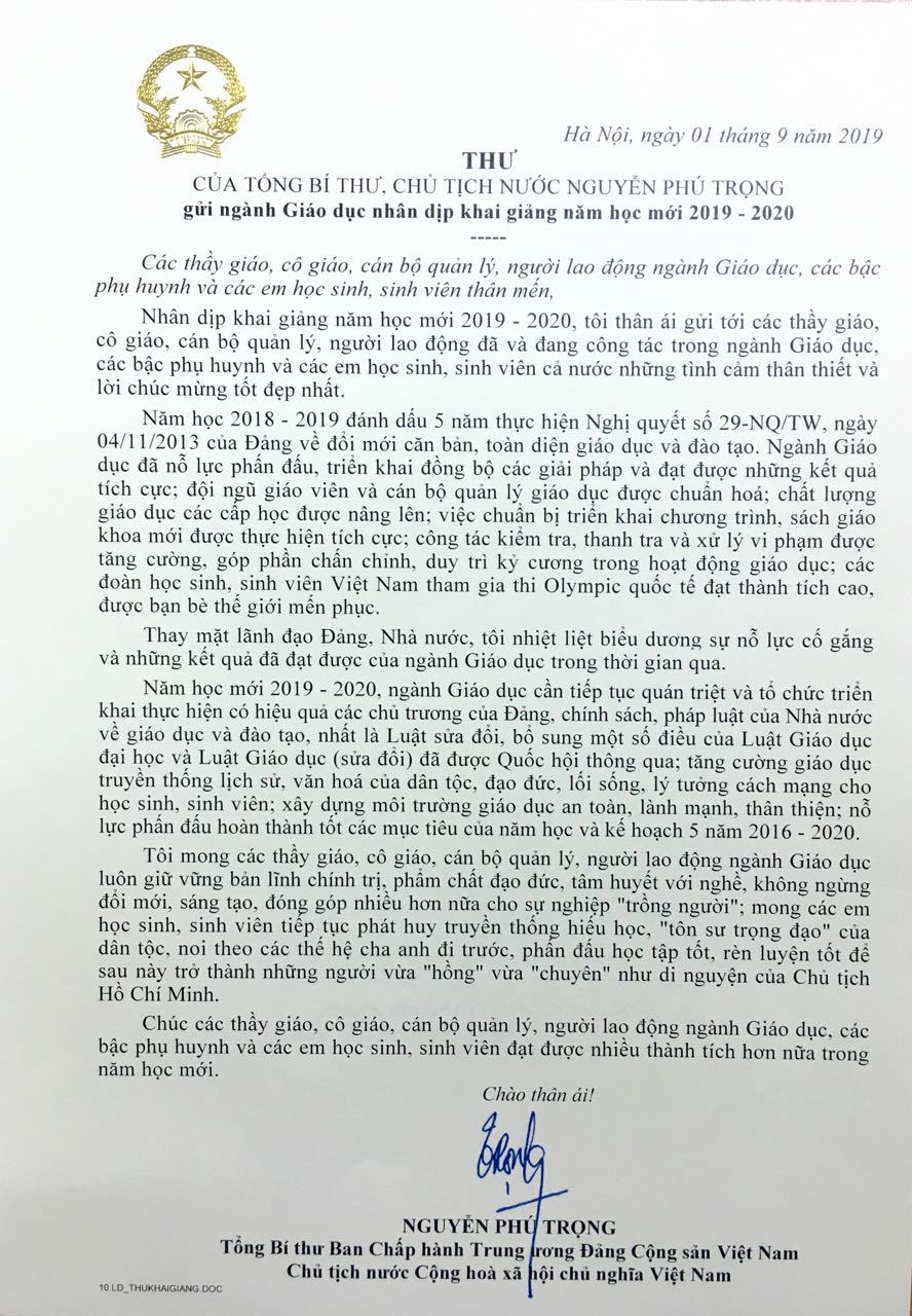 Nhân dịp khai giảng năm học mới 2019-2020, tôi thân ái gửi tới các thầy giáo, cô giáo, cán bộ quản lý, người lao động đã và đang công tác trong ngành Giáo dục, các bậc phụ huynh và các em học sinh, sinh viên cả nước những tình cảm thân thiết và lời chúc mừng tốt đẹp nhất.