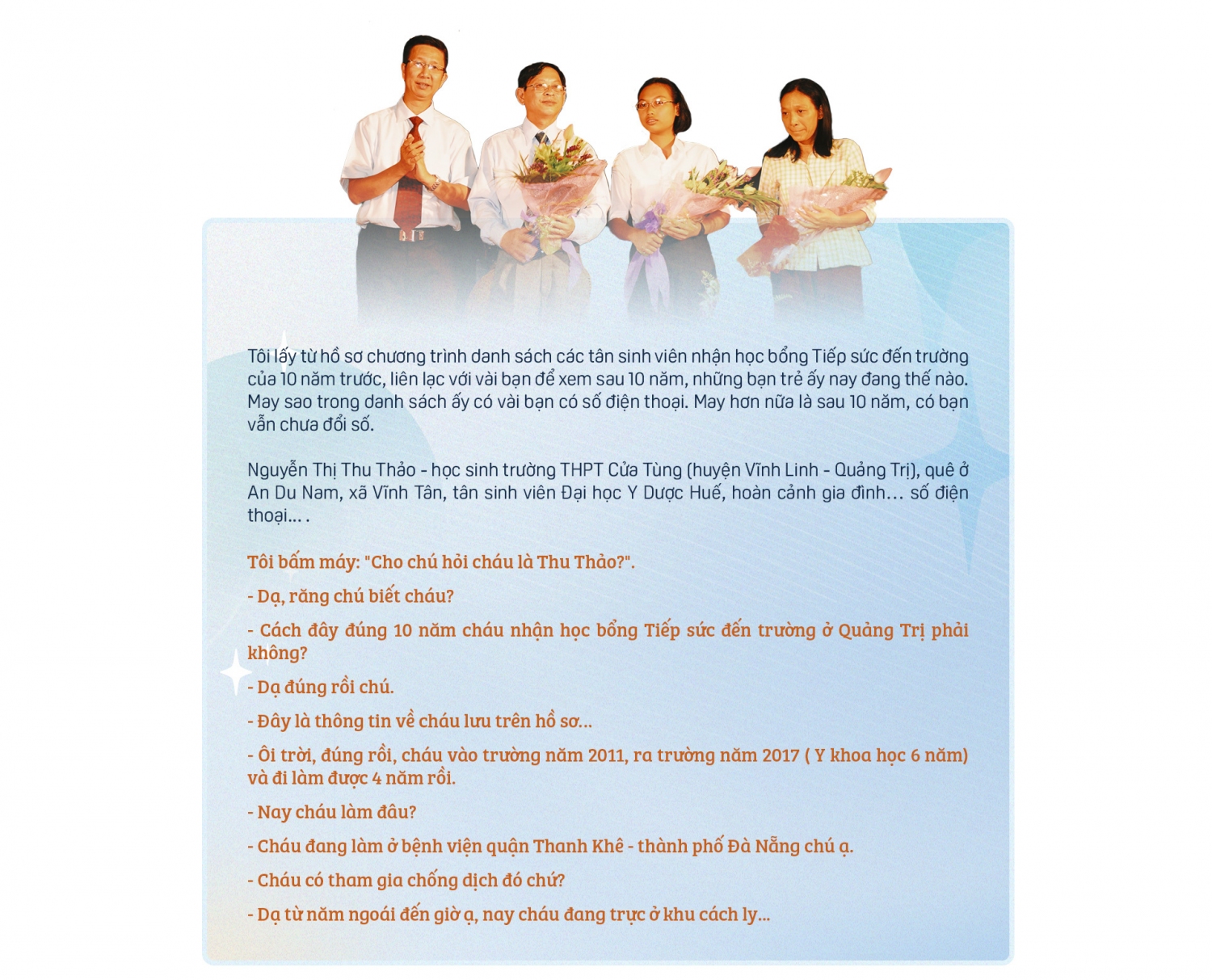 Chúng tôi sẽ còn trở lại với những câu chuyện về những thầy thuốc đã "khởi hành" từ học bổng Tiếp sức đến trường của Tuổi Trẻ. Tôi nhận ra một điều thú vị, rằng giữa những ngổn ngang thách thức của đại dịch, giữa những tân sinh viên cần được hỗ trợ để vượt qua khó khăn do dịch bệnh gây ra, trên trận tuyến này đã có những thầy thuốc từng là cựu sinh viên của chương trình. Hình ảnh ấy mang đến niềm vui giữa bao toan lo ngổn ngang. Và lớn hơn thế, đó là câu chuyện của sự trao truyền và tiếp nối.
